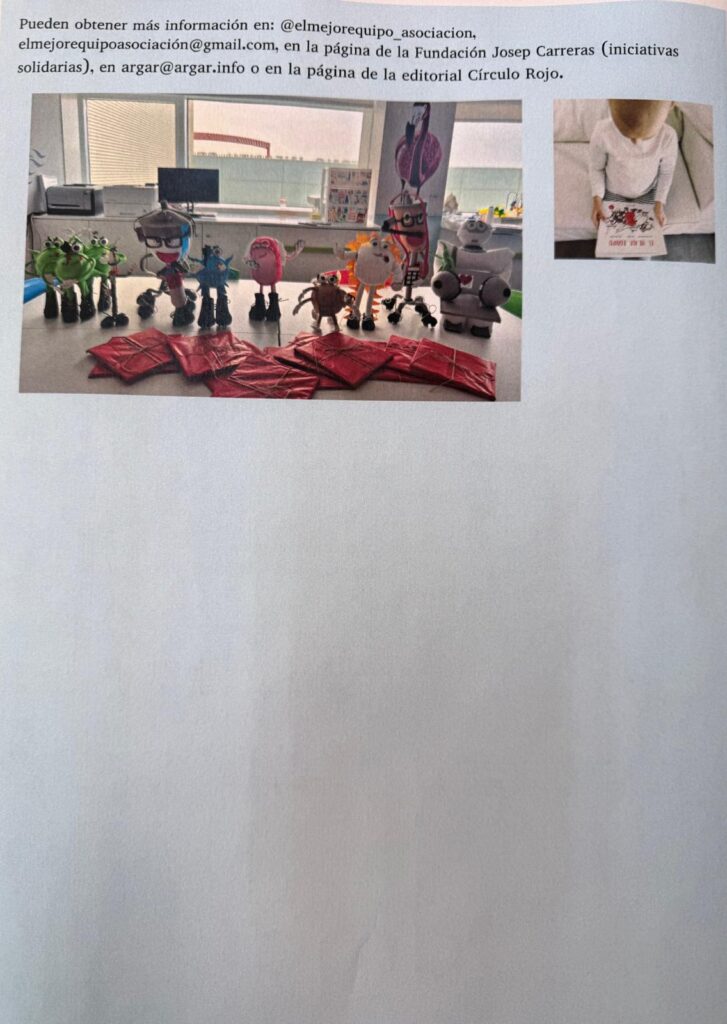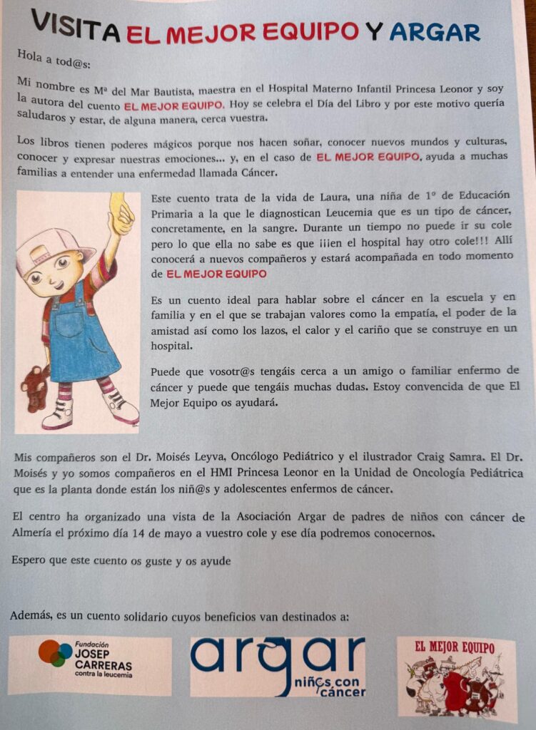 Para celebrar el Día del Libro con una causa solidaria, la AMPA La Marina ha visitado el CEIP Rafael Alberti para regalar un ejemplar de «El Mejor Equipo» a cada aula y a la biblioteca. Este cuento, escrito por la maestra hospitalaria Mª del Mar Bautista, narra la historia de Laura, una niña con leucemia que descubre que en el hospital también hay un colegio y un gran equipo que la acompaña. Es una obra ideal para trabajar la empatía, la amistad y entender el cáncer desde la esperanza y el cariño. Además, es un proyecto solidario cuyos beneficios apoyan a la Fundación Josep Carreras y a la Asociación Argar. Agradecemos profundamente a la AMPA su gran labor, ilusión y compromiso constante por mejorar nuestro colegio día a día. El día 14 de mayo contaremos en nuestro colegio con el equipo del hospital y sus mascotas para contarnos el cuento de primera mano. Nuestro agradecimiento a María del Mar y su equipo. A continuación les dejamos algunas fotos de la visita de hoy. Esperamos que les gusten.